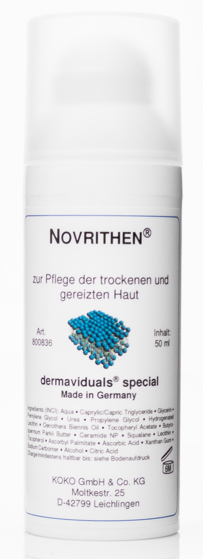La crème Novrithen® contient de l'urée, de l'huile d'onagre et du DMS. DMS est l'abréviation de Derma Membrane Structure, un complexe de substances actives composé de triglycérides, de beurre de karité, de squalane et de phosphatidylcholine particulièrement bien tolérés en termes de sébum.