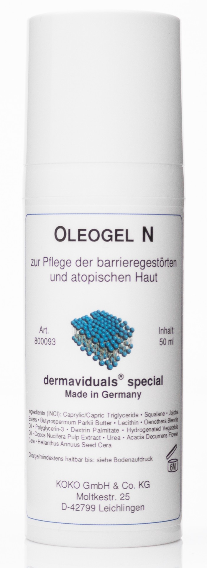 L'oléogel N contient des huiles végétales et des substances barrière ainsi que de l'urée et de l'huile d'onagre sur une base exempte d'eau. La peau absorbe rapidement le produit, du fait de sa teneur élevée en phosphatidylcholine naturelle.