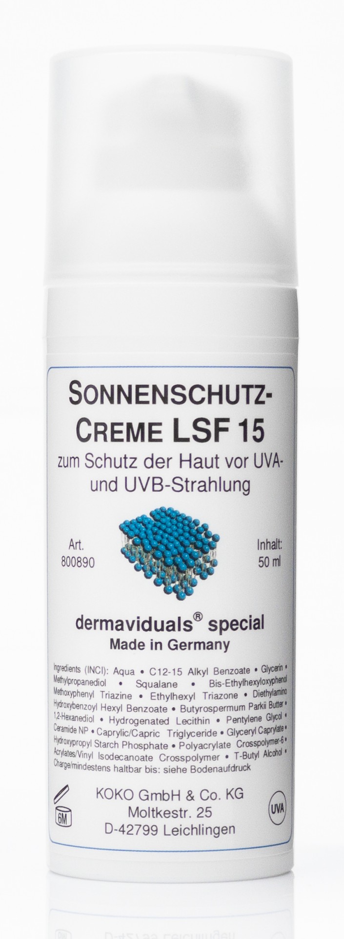 La crème de protection solaire d'incide 15 contient des composants DMS et des filtres de protection solaire contre les rayons UV-A et UV-B.