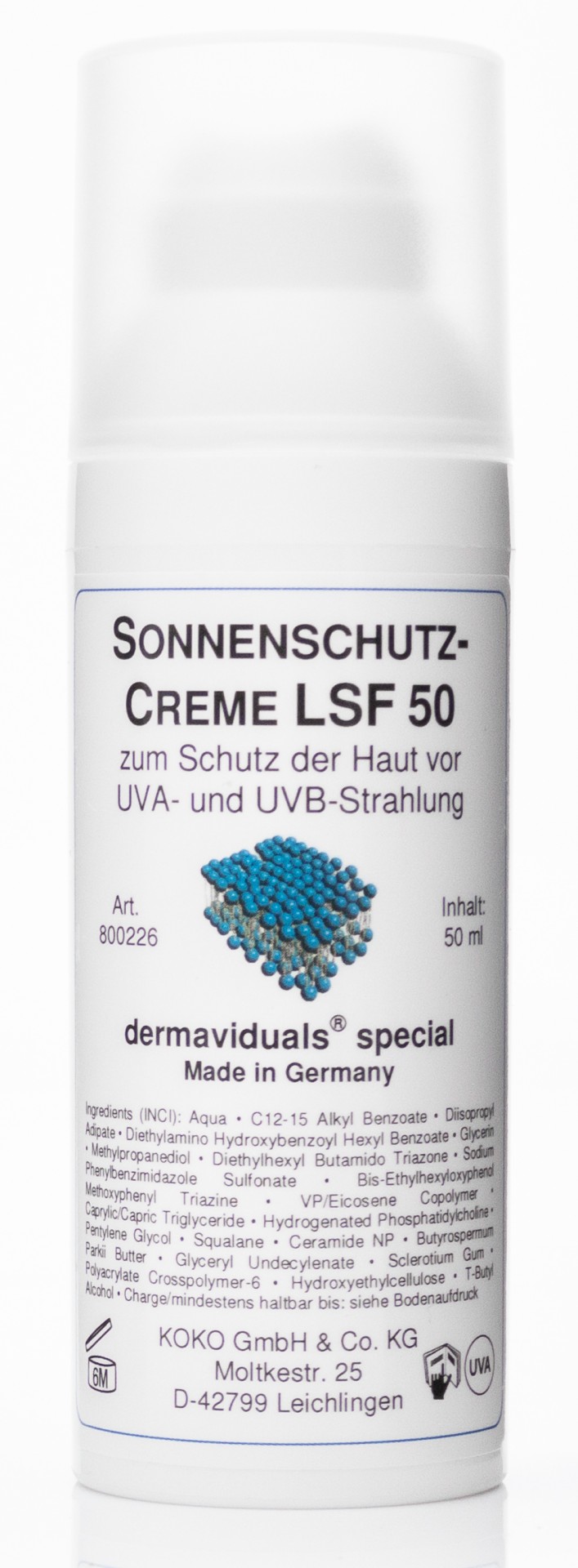 La crème de protection solaire d'incide 50 contient des composants DMS et des filtres de protection solaire contre les rayons UV-A et UV-B.